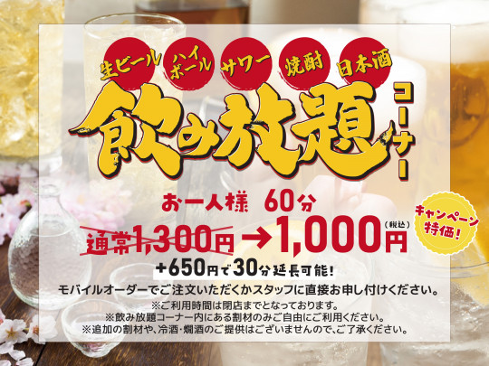 ※飲み放題はご注文頂いたご本人のみとさせていただきます。回し飲みはご遠慮下さい。