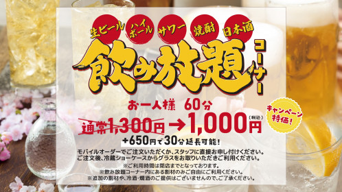 生ビール、ハイボール、サワー、焼酎、日本酒を飲み放題にてお楽しみ頂けます。