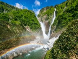 落差350m、日本一の称名滝。水しぶきをあげながら、ダイナミックな滝が流れ落ちる光景は圧巻!